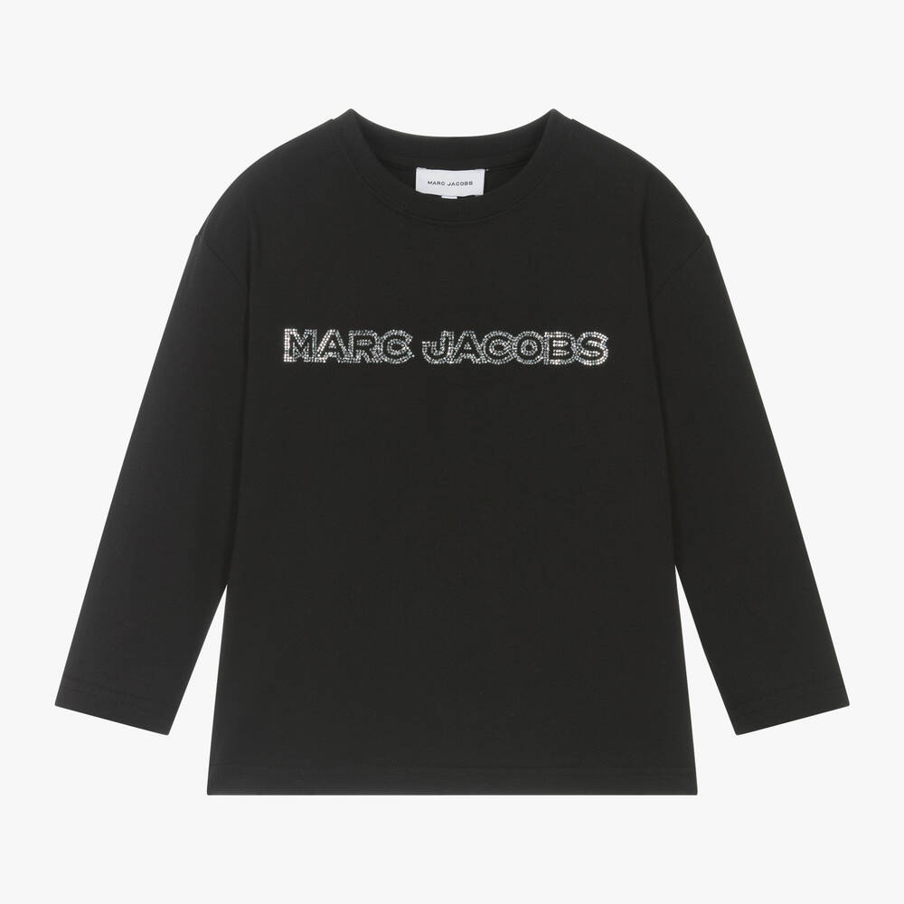 Black long-sleeved Mini-me cotton top for girls by MARC JACOBS, made in soft and comfortable jersey. Adding a touch of designer style to this casual wardrobe staple, it has a sparkly diamanté logo across the front.