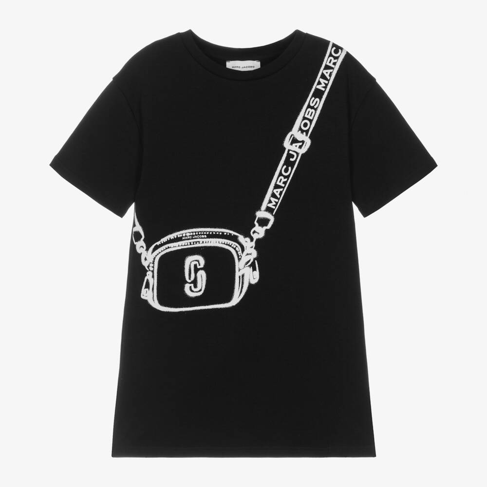 Black T-shirt dress for girls by MARC JACOBS, made from soft cotton jersey. Symbolic of the brand, it has a signature Snapshot bag printed in a stylish trompe-l'oeil design across the front, with a white spray painted effect. The light ribbing on the neckline has gentle stretch for easy dressing.