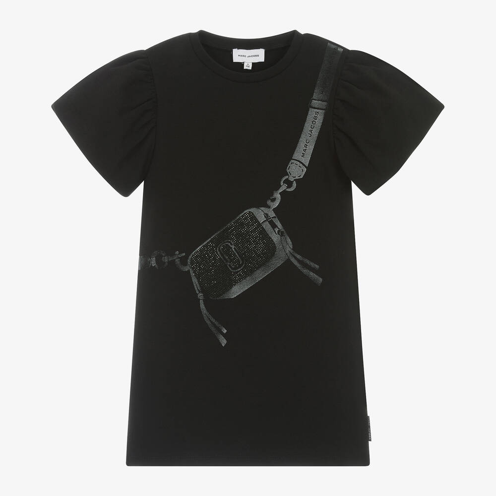 Combining style and comfort, this black cotton dress for girls by MARC JACOBS is made in soft, mid-weight jersey. Symbolic of the brand, it has a signature Snapshot bag in a cool trompe-l'oeil design across the front, in shiny, tonal print with sparkly black diamantés. Dramatic puffed sleeves add a stand-out touch to this simple A-line style and there is an embroidered logo tab on the side seam to complete the look.