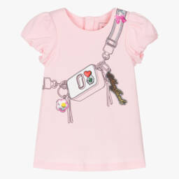 Casual black T-shirt dress for girls by American brand MARC JACOBS, made from soft organic cotton jersey with a ribbed, crew neckline. It is printed with large white, spray paint-effect spots and finished with a pink and white spray paint logo on the front.