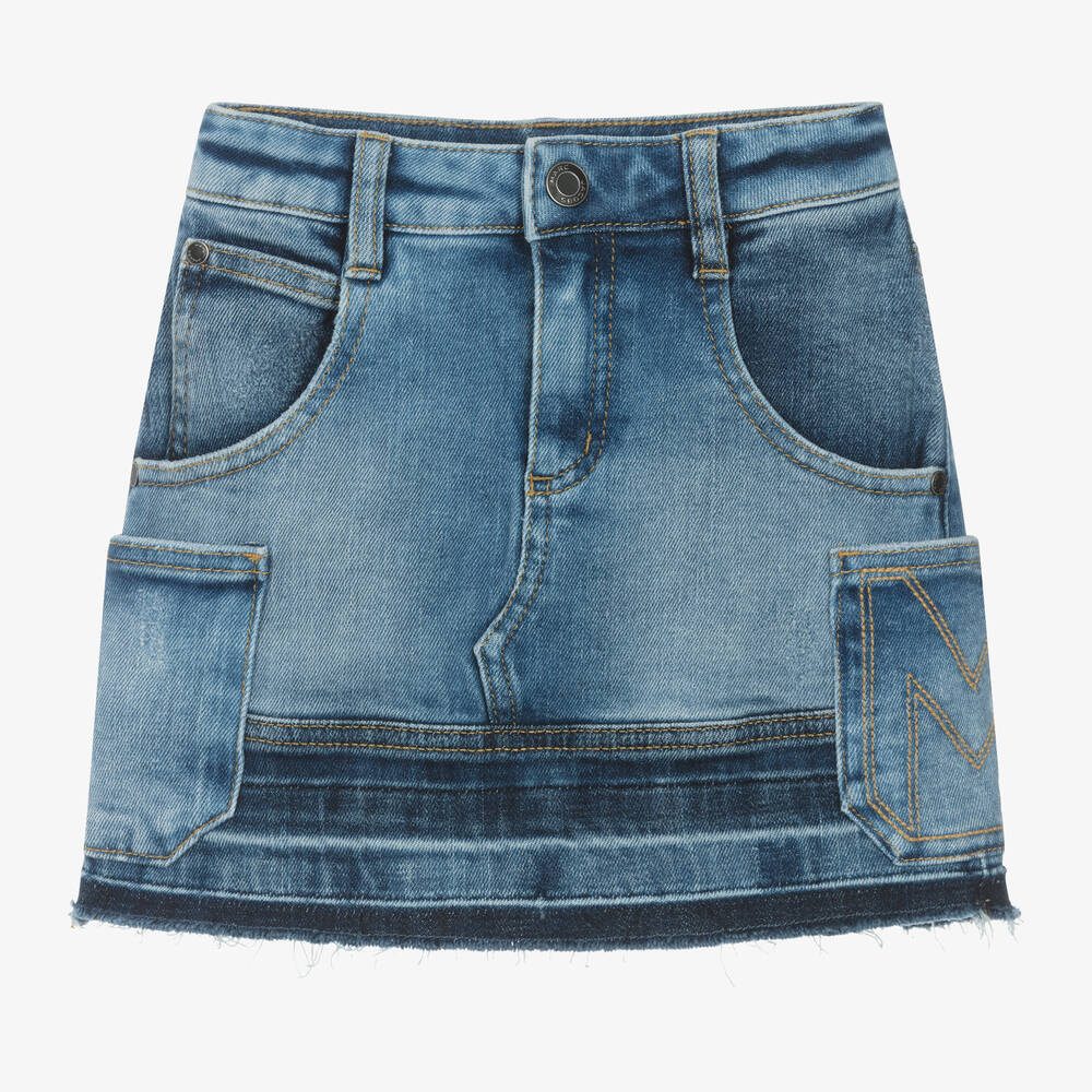 Blue patchwork skirt for girls by MARC JACOBS, made in soft stretch denim with contrast stitching and a frayed hemline. Fastening with a popper and zip, this classic style has branded rivets on the front pockets and a black rubberised logo patch on the back of the waist. Signature 'M' stitching adds detail to the back and side pocket. The adjustable waist can be tightened or loosened depending on the desired fit.