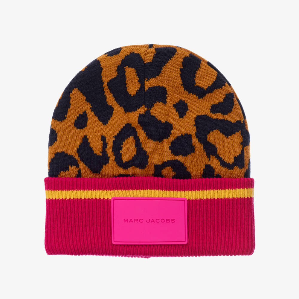 Fun orange and black cheetah print beanie hat for girls by MARC JACOBS, knitted in a soft, mid-weight cotton and wool blend. Warm and cosy, this double layer hat has an eye-catching bright pink turned-up brim with a yellow stripe and a large neon pink rubber logo patch for a stand-out designer statement.