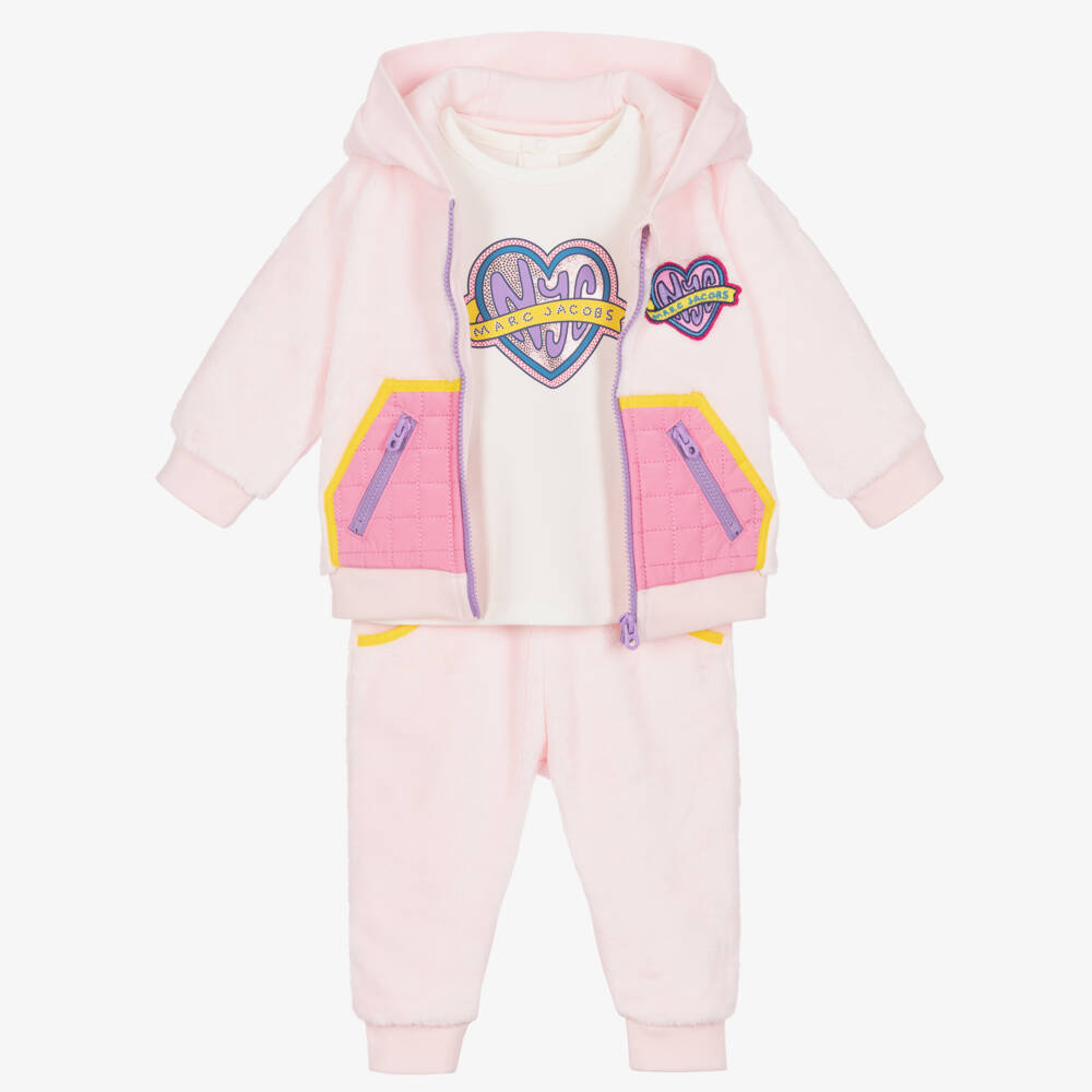 A pale pink hooded tracksuit for little girls by MARC JACOBS, with contrasting pink, yellow and purple trims. Cosy and warm, it is made in soft plush fleece. The zip-up top has zipped pouch pockets on the front, with a heart logo appliqué on the chest. The joggers have an elasticated waistband with a faux drawstring detail. The tracksuit comes with a white long-sleeved T-shirt, printed with a matching heart logo on the front, and fastening with poppers on the back.