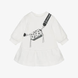 Patterned in a jumbled tonal logo and the designer's Daisy flower in black and yellow, this pale pink dress for girls is by MARC JACOBS. It is pleated around the neckline and has voluminous puffed sleeves for added drama. Woven in soft cotton jacquard, this statement dress has a lightweight cotton lining and fastens with a concealed zip on the back.