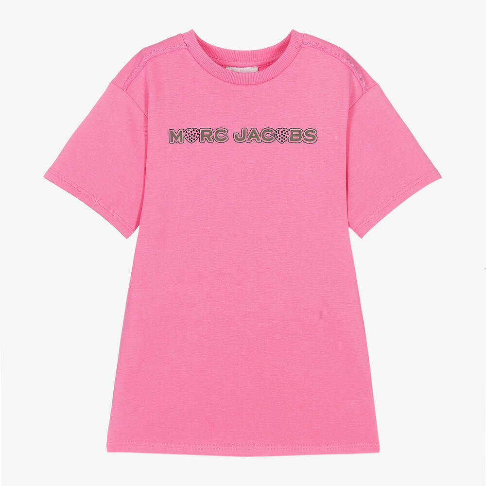 A bright pink dress for girls by MARC JACOBS, made in soft, mid-weight cotton jersey. Designed in a comfortable T-shirt style, it has a green logo printed on the front, detailed with black rhinestones. There are frayed trims across the shoulders and completing the cool, casual look, the back of the dress features two patch pockets.