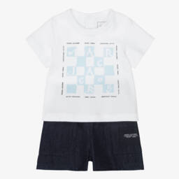 Fun white and pink cotton jersey shorts set for little girls unmistakably by MARC JACOBS. It has the brand's iconic Snapshot bag printed on the T-shirt, with pink flowers and the Double-J logo. The shorts have a useful flap pocket on the front and a comfortable, elasticated waistband.