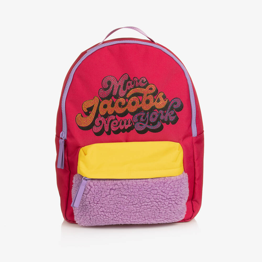 A bright fuchsia pink backpack for girls by MARC JACOBS, woven in a durable fabric. Playfully chic, this stylish bag has a retro-inspired diamanté logo, with a yellow and purple zip-up teddy shearling pocket. The main compartment fastens with a dramatic chunky zip, and has an elasticated internal pocket to keep things organised. This bag can be held using the carry handle, or worn using the adjustable shoulder straps.