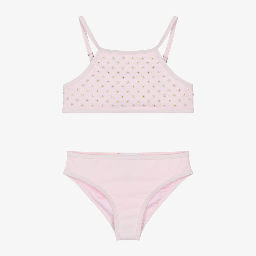 Pale pink bikini for girls by MARC JACOBS. The front of the top is decorated with the designer's Daisy flower, in a sparkly diamanté pattern, with elasticated adjustable straps providing an ideal fit. The bottoms are printed with the designer's name for a branded finish. Silky soft and stretchy, both pieces are fully lined for comfort and modesty.