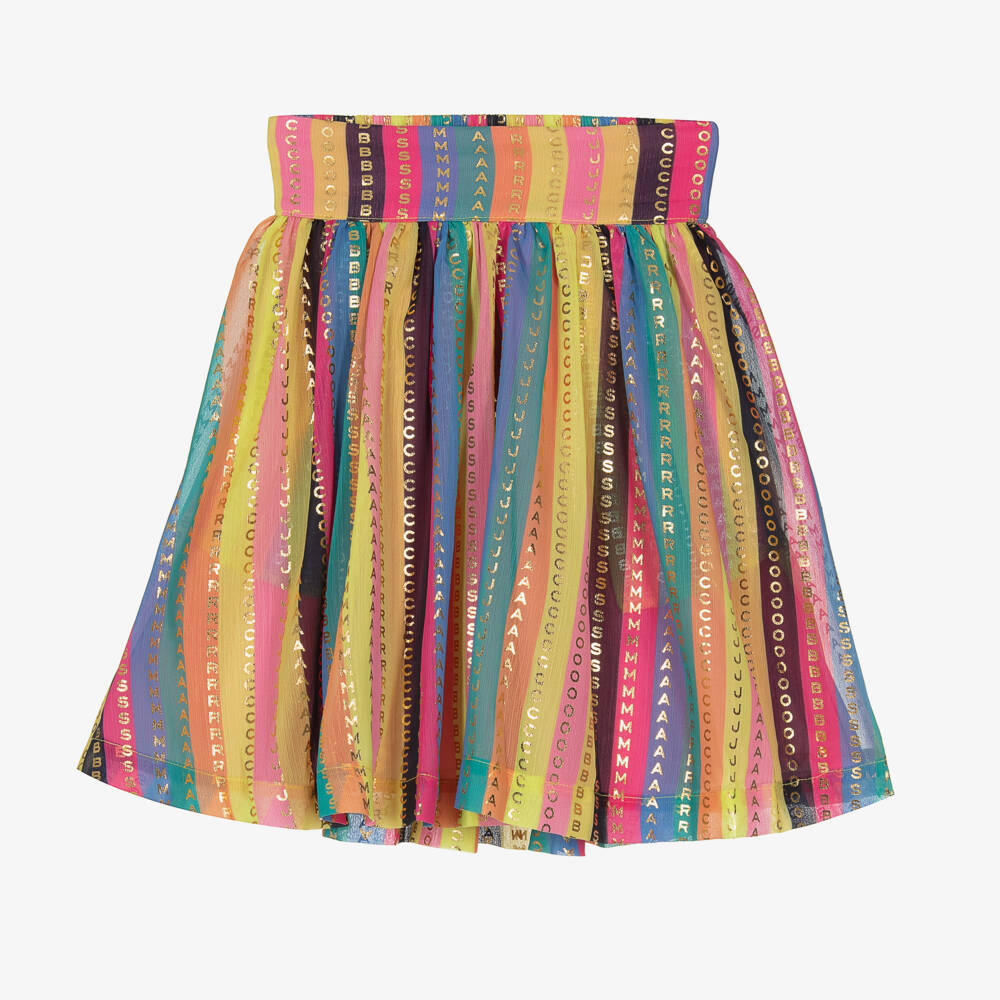 A vibrant skirt for girls by American designer MARC JACOBS, made in soft and lightweight chiffon. For visual appeal, it is characterised by a repeat metallic gold logo print set on a multicoloured stripe background. It is elasticated on the back of the waist and gently gathered for movement. The pink lining is lightweight and soft and creates an opaque underlayer for this semi-sheer piece.