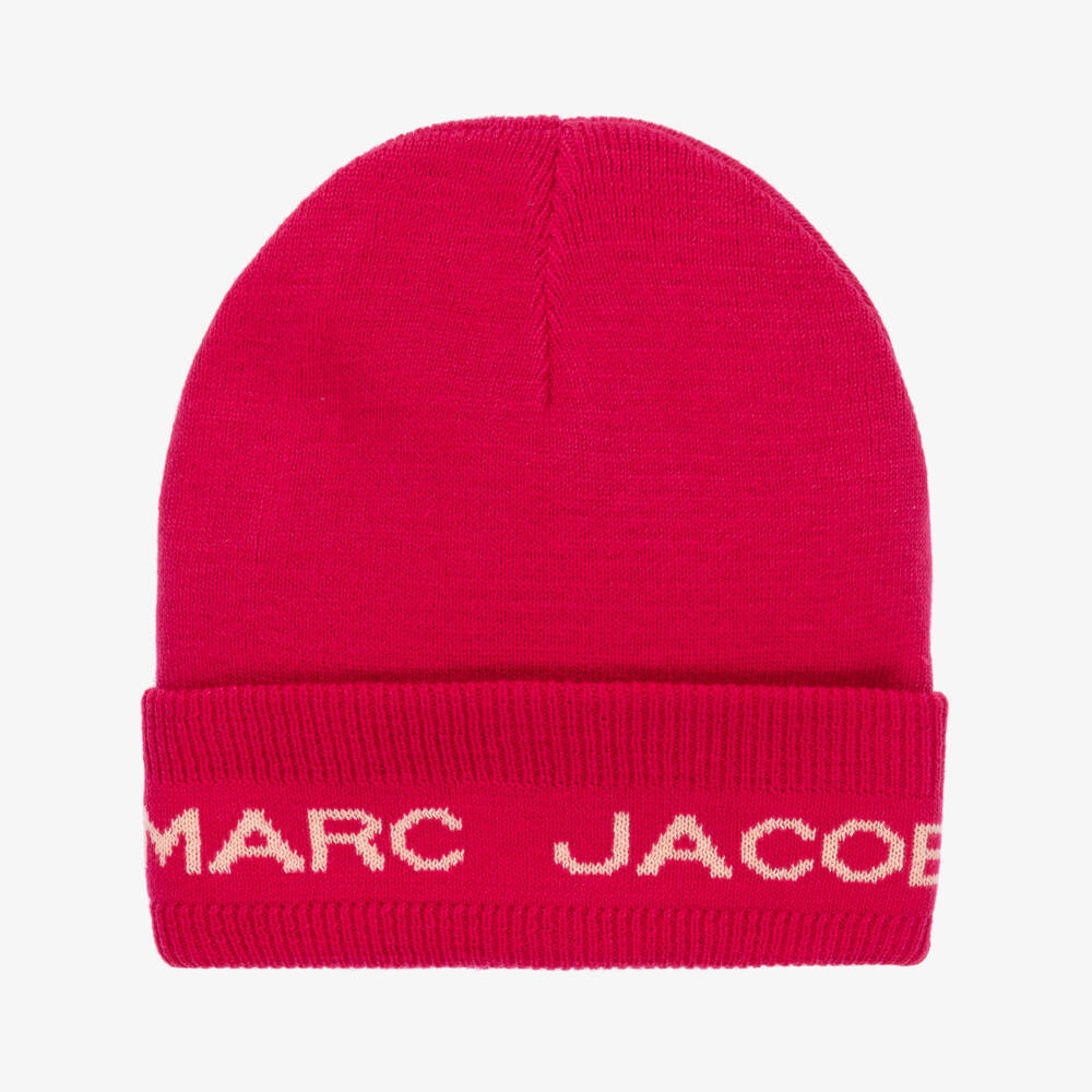 Deep pink oversized beanie hat for girls by MARC JACOBS, knitted in a soft cotton and wool blend. Warm and cosy, this mid-weight, double layer hat has a turned-up brim with a light pink jacquard logo across the front.