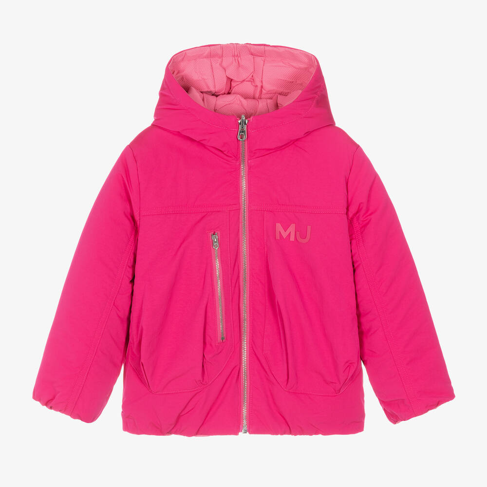 Gorgeous reversible pink jacket for girls by American brand MARC JACOBS, hooded and padded for warmth. The pale pink side has the label's jumbled logo embossed all over, with useful, slanted front pockets secured with branded poppers. The reverse side is bright pink, with a rubberised logo on the front and a rubberised, jumbled logo patch on the back. It has patch pockets, one of which has is double, with a zip fastening. The sleeves have elasticated cuffs and the zip fastenings are branded.