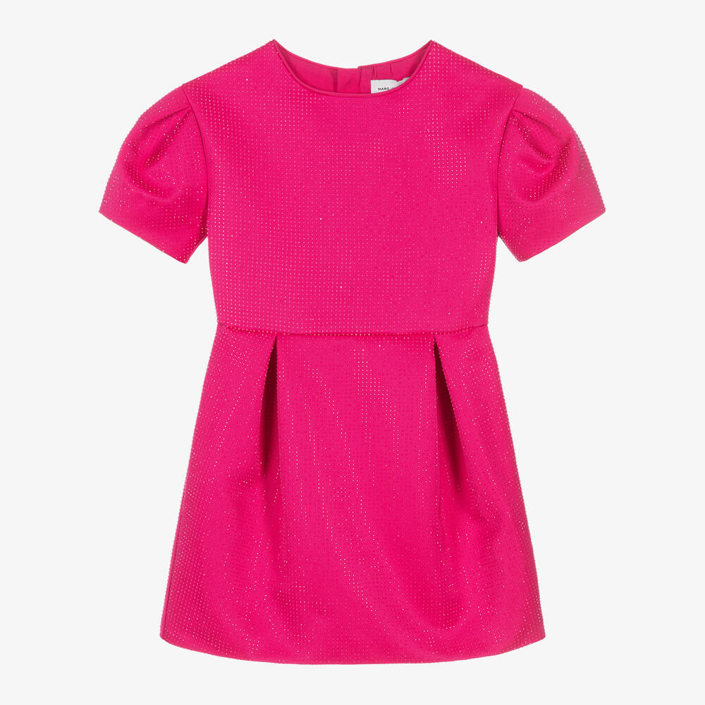 Bright pink occasion-wear dress for girls by MARC JACOBS, with fabulous puffed sleeves. Decorated with rows of edgy rhinestones, this stunning design is made in mid-weight, structured fabric, with pleating on the skirt and sleeves. The back fastens with a neat, hidden zip and the lining is lightweight, breathable viscose for comfort.