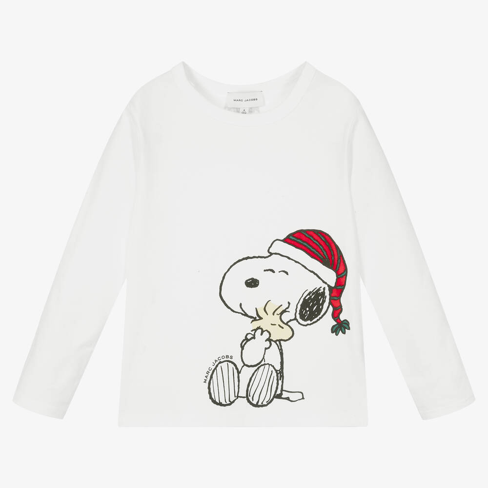 A long-sleeved white top for girls by MARC JACOBS, made in soft organic cotton jersey. From the Peanuts® x Marc Jacobs collaboration, this crew neck top has a sweet snoopy graphic print on the front wearing a soft textured red and green hat. The collaboration is marked with a small logo print on the back of the neck.