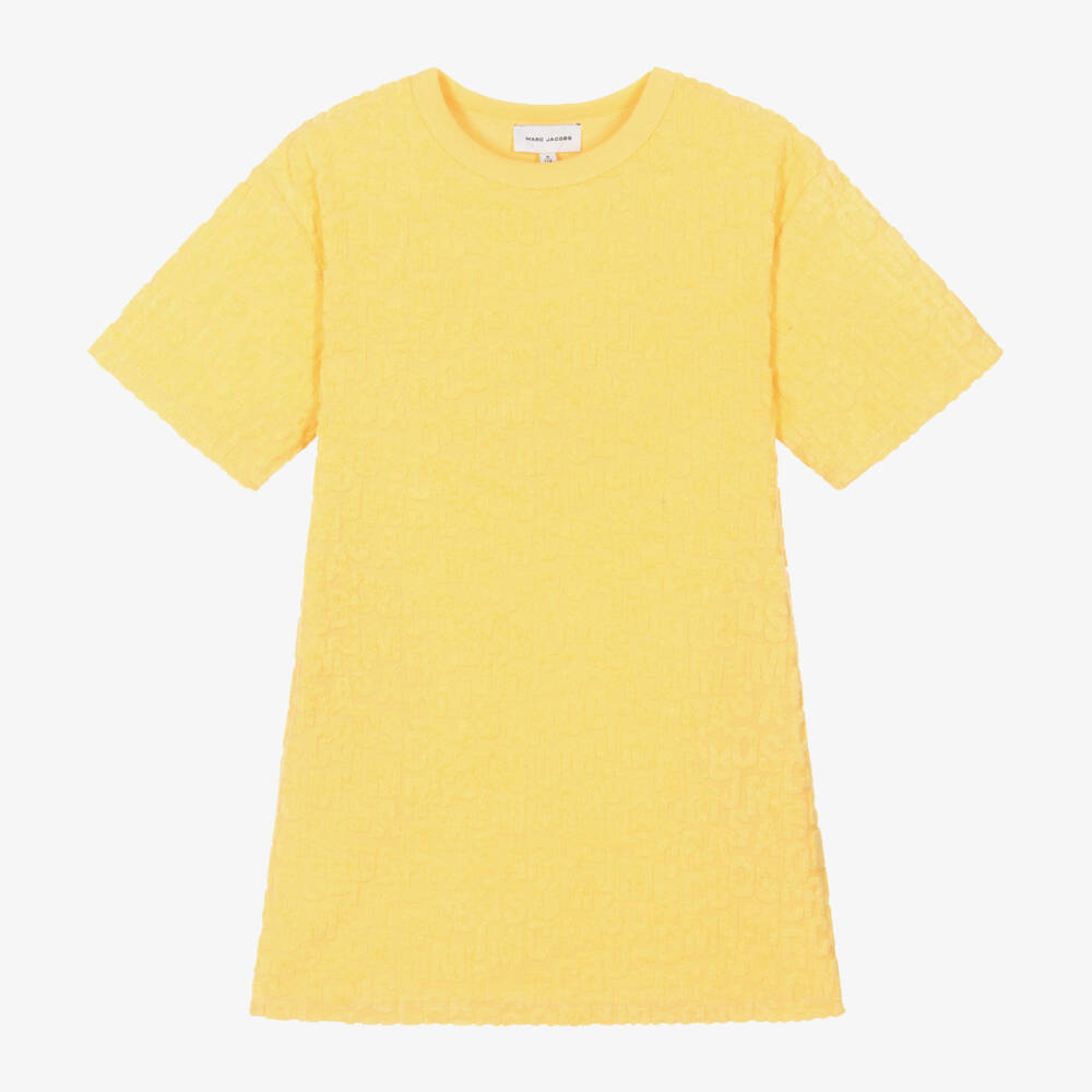 Eye-catching yellow dress for girls from MARC JACOBS, made in comfortable cotton-blend towelling. This simple, short-sleeved dress has a textured Jumbled logo pattern in tonal jacquard. It has a casual crew neckline and practical concealed side pockets.