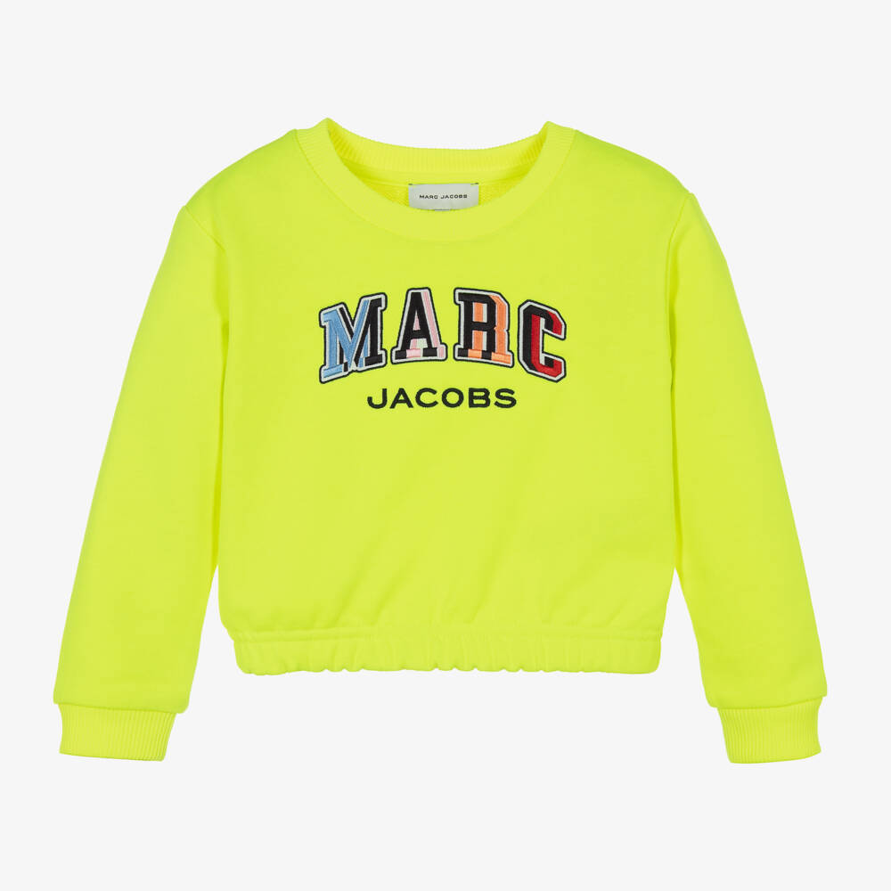 A neon yellow sweatshirt for girls by MARC JACOBS, made in soft cotton jersey with a looped underside. Boldly eye-catching, it has a colourful logo embroidered on the front. The elasticated hemline gives definition to this sporty, cropped style.
