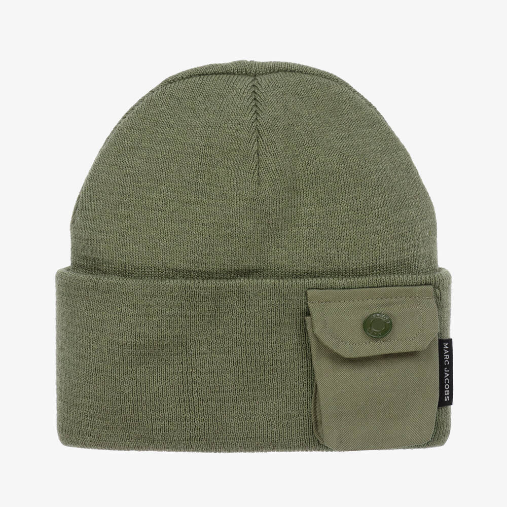Cool moss green beanie hat for boys and girls by MARC JACOBS, with a utility pocket on the brim. It is made in a cosy double layer and knitted with a touch of wool for added warmth. Made in contrasting twill fabric, the pocket fastens with a branded popper and is trimmed with an embroidered logo tab for a discreet designer finish.