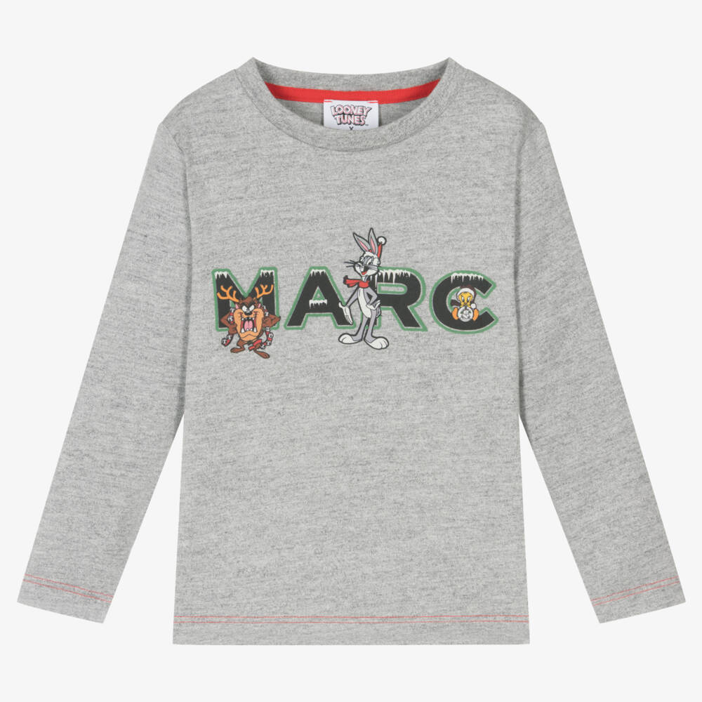 Grey organic cotton top for boys and girls by American brand MARC JACOBS, made in collaboration with Looney Tunes. It has snow-topped logo prints on the front and back, alongside the famous characters Bugs Bunny, Tasmanian Devil and Tweety Pie. This festive-themed top is made in super soft jersey, with red stitching across the shoulders and around the cuffs.