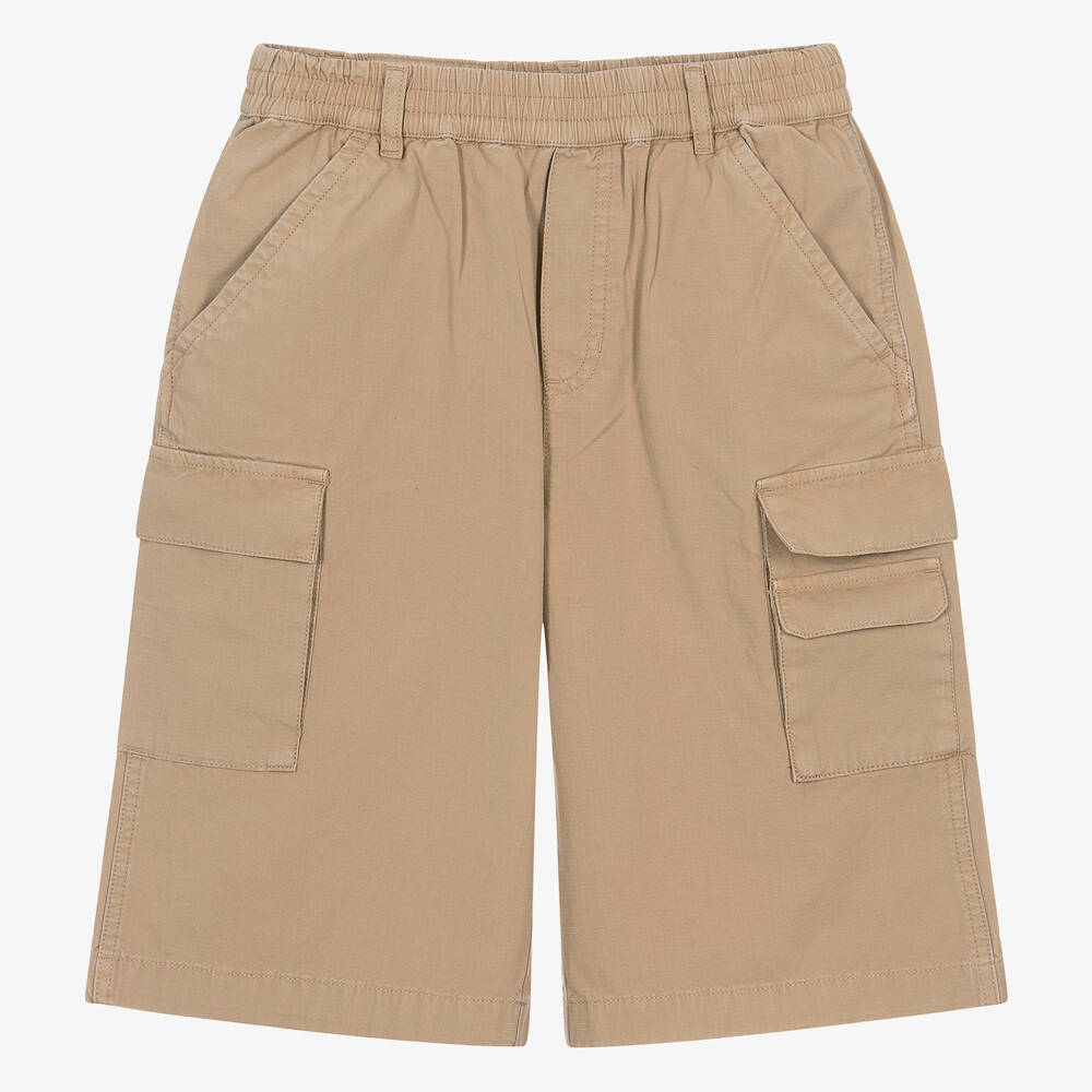 Beige shorts for teen boys and girls, by American brand MARC JACOBS. A comfortable casual style, these longer-length shorts have slanted pockets on the front and cool, cargo-style pockets on the legs. Adding a signature finish, a bright yellow logo patch can be seen on the back of the elasticated waistband.