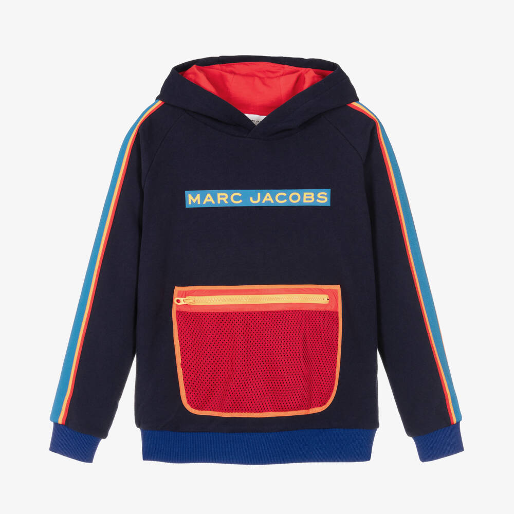 A navy blue hoodie for teen boys by MARC JACOBS, with bright neon orange trims. Made in soft mid-weight cotton jersey, this signature top has a bold logo print across the chest and sporty stripes on the sleeves. The mesh pocket on the front fastens with a branded orange zip, providing a secure space for small essentials.