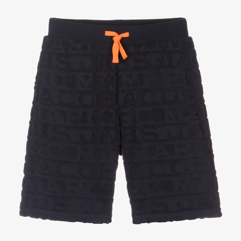 From American brand MARC JACOBS, casual navy blue shorts for teen boys with flocked jacquard logos for a subtle designer finish. Cool and comfortable they are made in soft cotton blend jersey and have a neon orange drawstring which adds a pop of colour as well as being adjustable for a better fit.