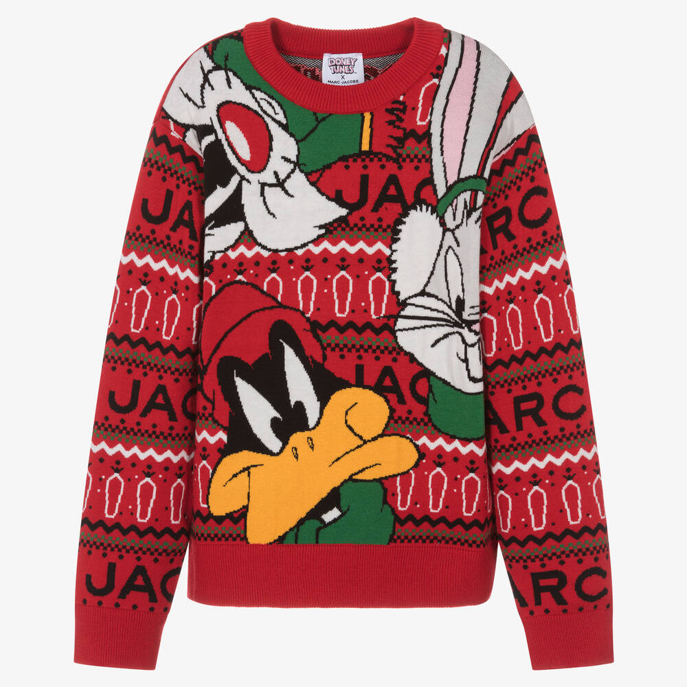Festive red knitted jumper for teen boys by American brand MARC JACOBS, made in collaboration with Looney Tunes. Soft and mid-weight, it has a Fair Isle-style pattern of logo letters and carrots, with Buggs Bunny, Daffy Duck and Sylvester on the front for a playful touch. Completing the designer look, it is patterned with a large collaboration logo on the back.