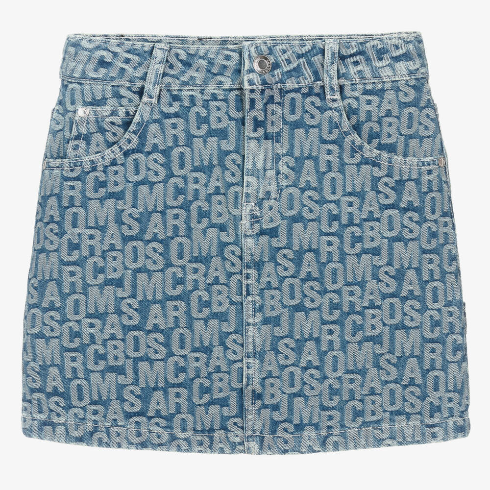 Mid-blue jacquard denim skirt for teen girls by American brand MARC JACOBS. Inspired by the adult collection, it is patterned in the designer's Jumbled logo, with a black rubberised logo jacron on the back. This five-pocket style fastens on the front with a zip and branded popper. It is made in soft, non-stretch cotton denim.