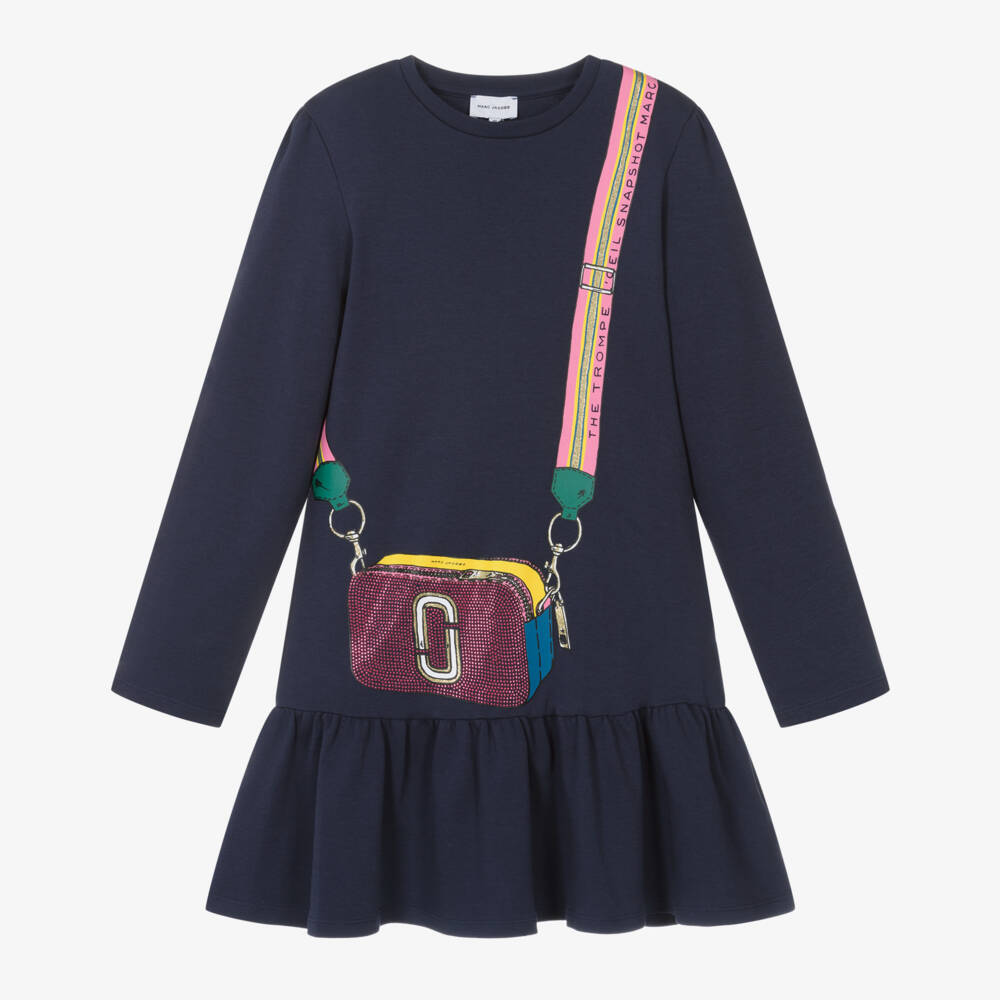 Stylish navy blue dress for teen girls from American brand MARC JACOBS. A colourful trompe l'oeil Snapshot Bag is printed on the front with glittery gold accents, incorporating the brand's Double-J logo, for a distinctive designer look. In an easy-to-wear casual style, it is made in a soft and comfortable cotton jersey, with gathers on the shoulders and a ruffled hem for a lovely feminine finish.