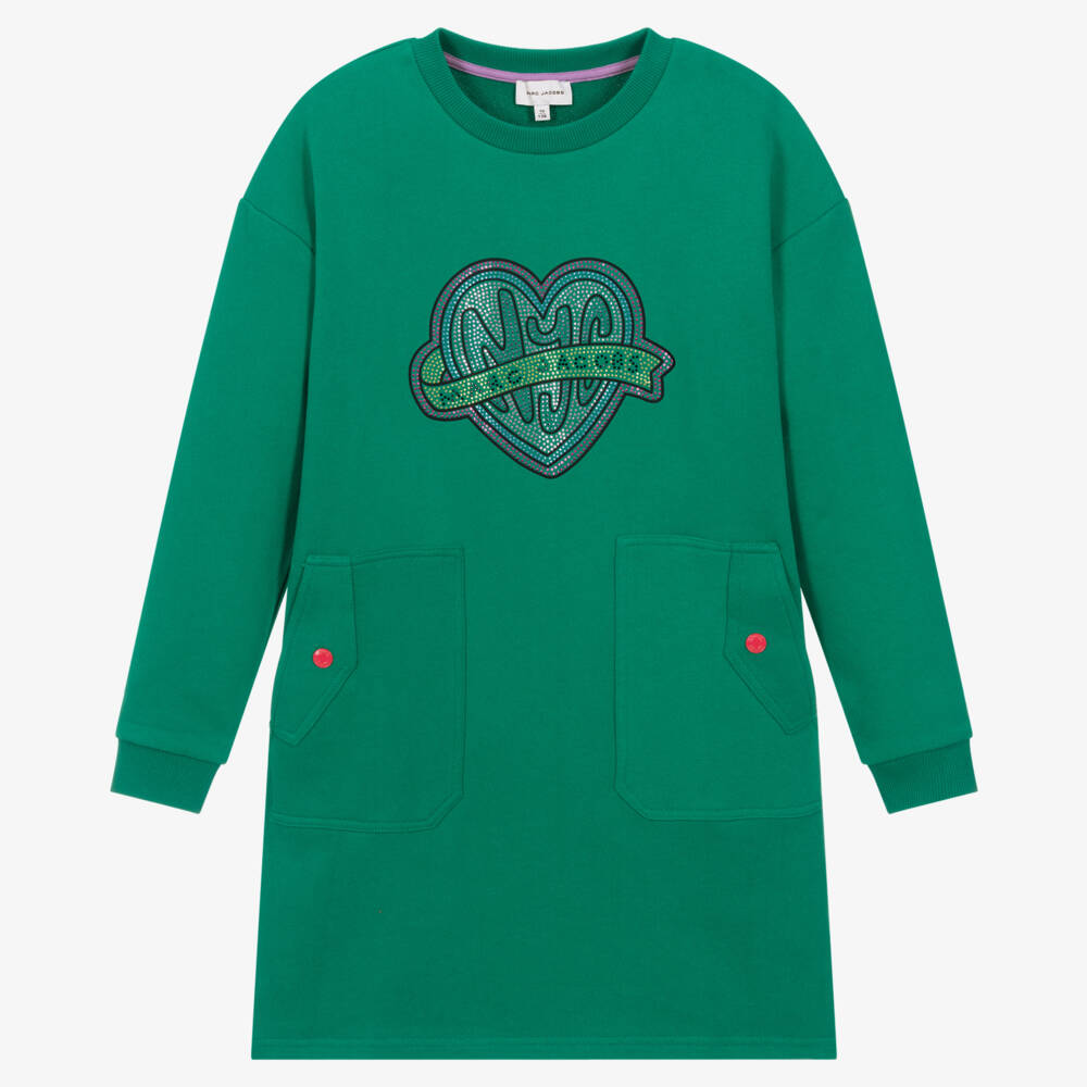 A green sweatshirt dress for teen girls by MARC JACOBS, standing out with a colourful rhinestone heart logo. Lovely on laid-back days, this cotton jersey dress has a relaxed fit with pockets and decorative pink poppers on the front.