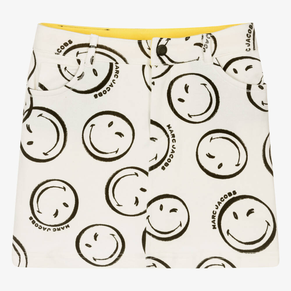 A casual ivory jersey mini skirt for teen girls by MARC JACOBS, in collaboration with Smiley. Playfully modern, they have a monochrome smiley face graphic with the streetwear brand's signature logo. There are bold yellow pockets on the back with subtle M stitching and a utility-style tab. Fastening with a popper and a zip, a branded rubberised badge finishes this organic cotton skirt.