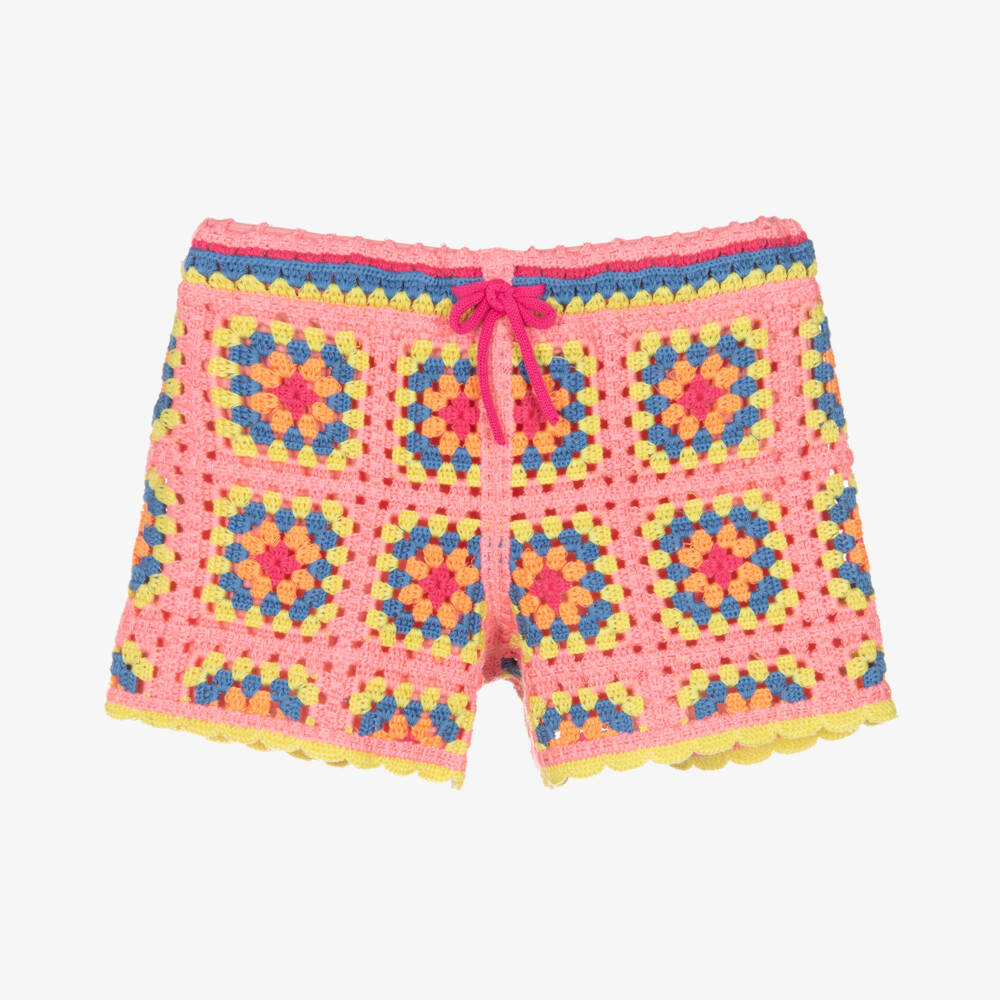Pink crochet shorts for teen girls by American brand MARC JACOBS, with a bold and playful floral patchwork pattern in green, blue and orange. A comfortable and easy-to-wear style, they have a soft cotton jersey lining and an elasticated waistband with faux drawstring detail.