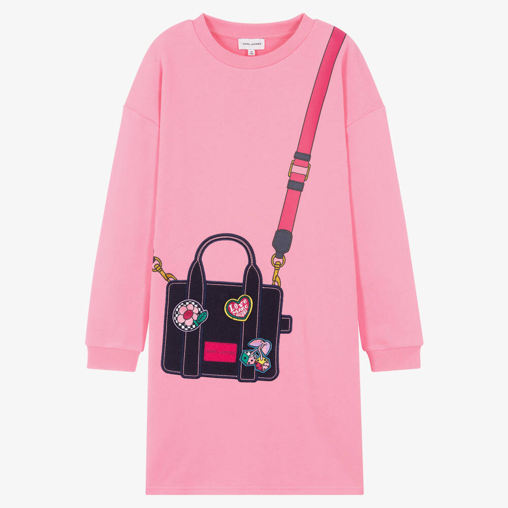 A pink cotton jersey sweatshirt dress for teen girls by MARC JACOBS, with the signature blue Tote bag appliquéd to the front. This relaxed dress has retro-inspired logo patches which secure onto the bag with velcro. A bright fuchsia pink logo badge is embroidered on the front for a striking designer finish.