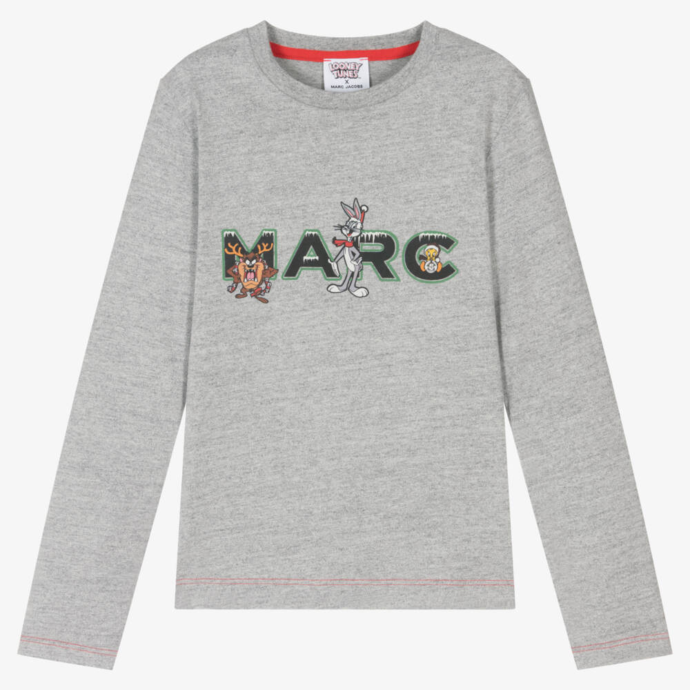 Grey marl top for teen boys and girls by MARC JACOBS, forming part of the Looney Tunes collaboration. The signature logo prints on the front and the back are outlined in green and topped with snow for a festive feel. The famous characters Bugs Bunny, Tasmanian Devil and Tweety Pie are also incorporated into the design. It is made from soft organic cotton jersey, with red stitching across the shoulders.
