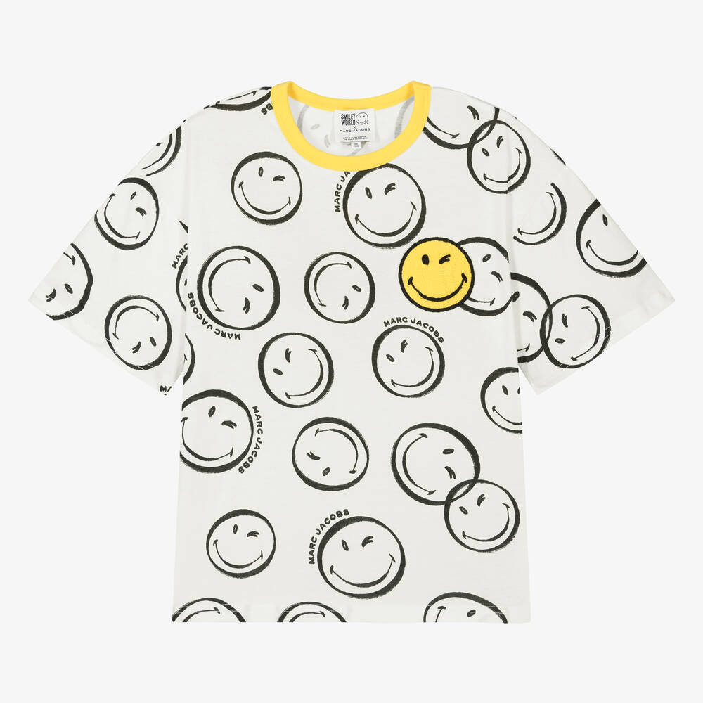 Teen boys and girls ivory jersey T-shirt, designed by streetwear brand MARC JACOBS. Working in collaboration with Smiley, it is printed with the brand's iconic smiley faces in a modern, monochrome style. The embroidered smiley, Marc Jacobs motif and crew neck stand out in yellow, adding a bold pop of colour. This short-sleeved tee is made from relaxed organic cotton.