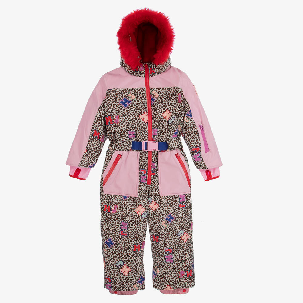 Create an impact with this beige and brown micro cheetah print snowsuit for teen girls by MARC JACOBS. Silky smooth and padded for warmth, it has contrasting pink trims, a rubber logo patch on the sleeve and scattered MJ logo print for a splash of colours. The hood is lined in red polar fleece with cute ears on the top and a detachable faux fur trim. This fun design has taped red zips, inner leg gaiters and jersey sleeve cuff inserts for better protection against the elements. The waist has a built-in, blue elasticated belt with a pink buckle clip fastening on the front.