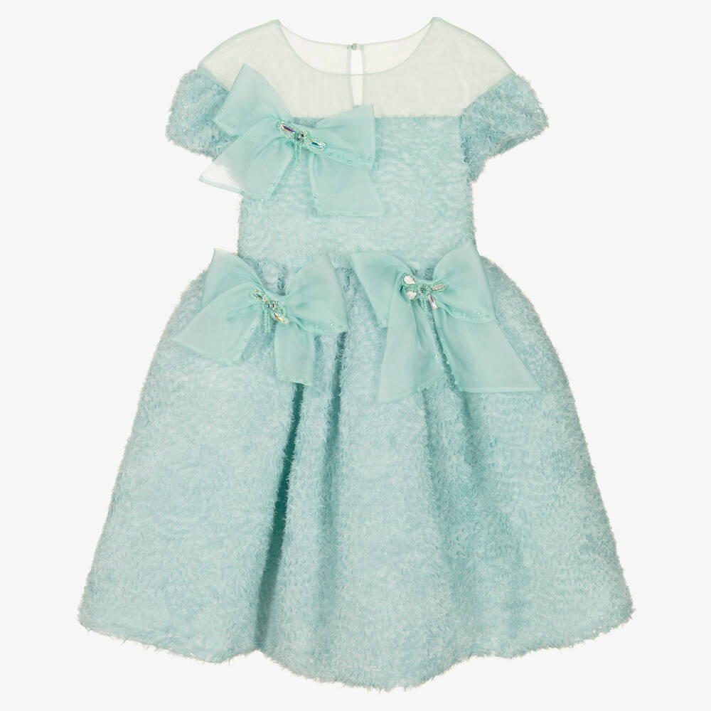 Stunning mint green dress for girls by luxury American brand Marchesa Kids Couture, ideal for special occasions. Made in layers of chiffon, organza, and tulle, it has a beautiful voluminous silhouette and is lined in silky satin for added comfort. The main fabric has a feather effect created from frayed soft tulle and is finished with bows embellished with sparkly beads. The zip fastening on the back is concealed for a neat finish and the button fastenings are iridescent for added glamour.