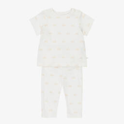 Lovely pale blue knitted trouser gift set for baby boys designed by the Greek princess Marie-Chantal. It is made in a luxuriously soft cotton and cashmere blend with cosy ribbed trims. The sweater has a cutwork crown on the front, with a shiny gold logo embroidered by the hemline and fastens with useful logo buttons on one shoulder. The trousers have a matching crown and star on the knees and a faux drawstring on the elasticated waistband, just right for little tummies. They come with a super soft Pima cotton jersey bodysuit, with a poplin Peter Pan collar that is beautifully embroidered with 'Home Sweet Home' and a little house in yellow and blue.