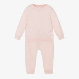 Lovely pale blue trouser set for baby boys and girls by Marie-Chantal, made in a soft cotton knit with a touch of cashmere for added warmth and luxury. The long-sleeved top has a cute pointelle crown on the front and button fastenings on one shoulder. The trousers have a matching pointelle crown and a star on each knee and a comfortable elasticated waistband with a sweet bow on the front.