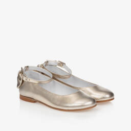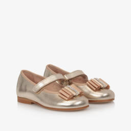 In a lovely shade of pale gold, these classic Mary Jane shoes for girls are by Marie-Chantal. They are made in luxuriously smooth leather with suede leather soles, and trimmed with the designer's signature Angels Wings at the back. Lightweight and comfortable, they secure on the foot with a button fastening strap.
