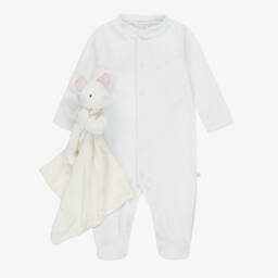 Lovely pale pink babysuit and ivory comforter set for girls by Marie-Chantal. The babygrow is made in soft cotton velour, with front popper fastenings and the brand's signature angel wings on the back. The adorable mouse comforter is in a combination of soft plush and velour and just right for little hands to hold. Presented in a beautiful branded box, the set makes an ideal gift for a new arrival.