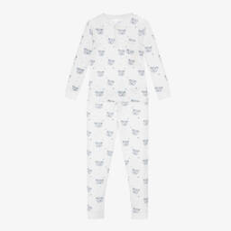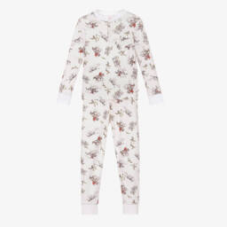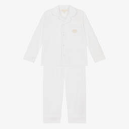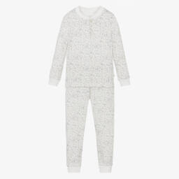 Pretty blush pink long pyjamas for girls by Marie-Chantal, made in super soft Pima cotton jersey. Patterned with the brand's signature Angel Wing print in metallic gold, they have frilly elasticated cuffs and embroidered picot trims. The top has a sweet Peter Pan collar and button fastenings on the front and the bottoms have an elasticated waistband for comfortable wear.