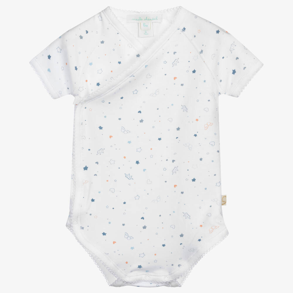 Baby boys white bodyvest by Marie-Chantal, made in super soft Pima cotton. It has a light blue star, angel wing and crown print. Edged with white embroidered cotton lace, it crosses over at the front and fastens with poppers The fit can be quite small, so Marie-Chantal advises you to choose a size up if you want room to grow.
