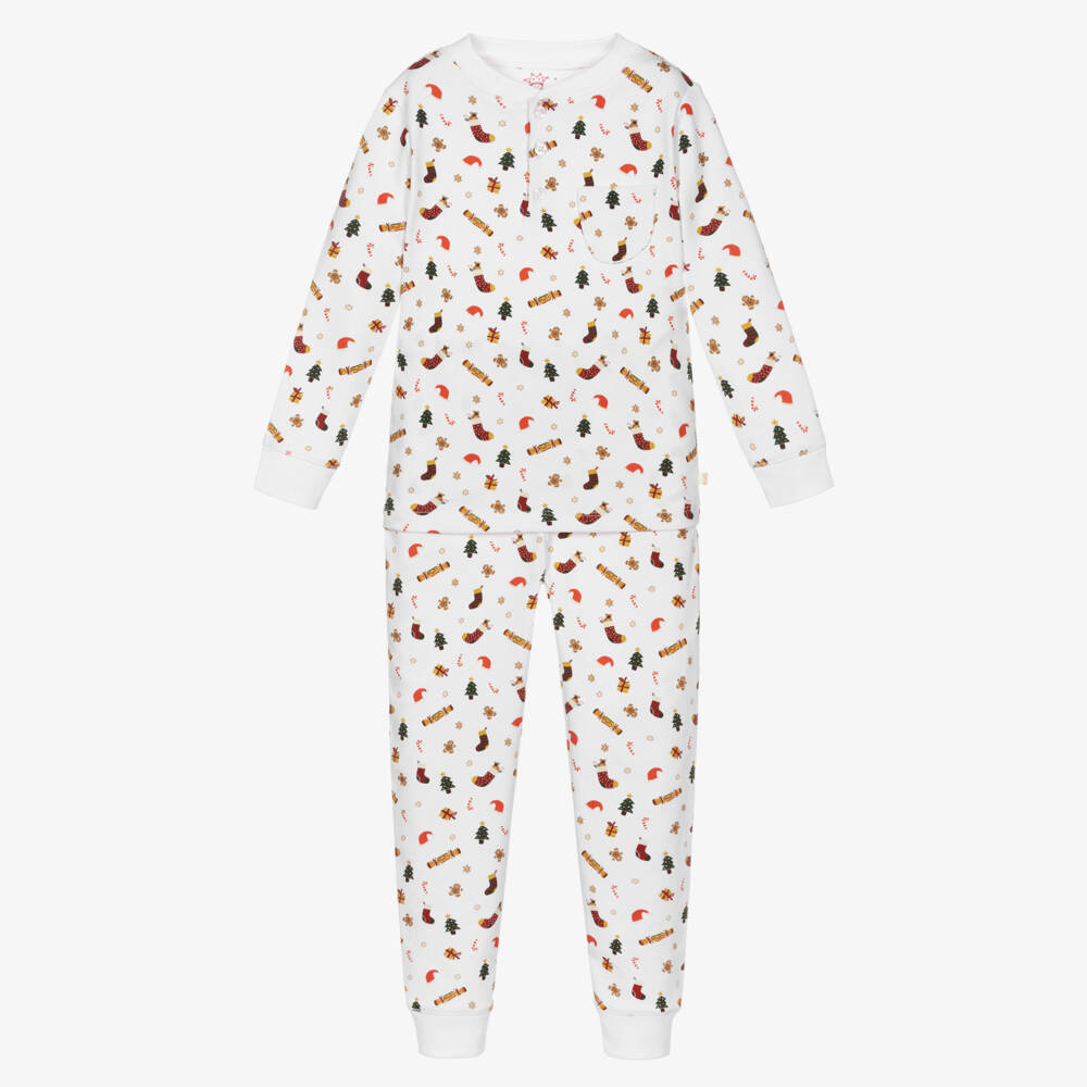 White festive snug fitting pyjamas for boys and girls by Marie-Chantal. Made with the softest organic cotton jersey, this comfortable set is patterned with a sweet Christmas themed candy cane, gingerbread man and Santa hat print. The top has a little front pocket and branded front button fastenings. The bottoms have decorative front buttons and a stretchy waist.