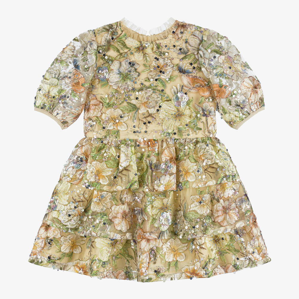 Girls Beige Sequinned Floral Tulle Dress