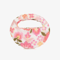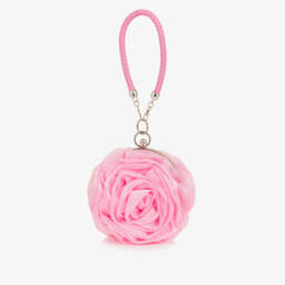 Girls pretty pink floral handbag by Marlo Kids, featuring a large, eye-catching flower appliqué embellished with a sparkly diamanté. Ideal for special occasions, this lightweight bag has a silver-tone chain strap and two carry handles. The open compartment is lined and has a small inner pouch which can be fastened in place for carrying small essentials or used separately.