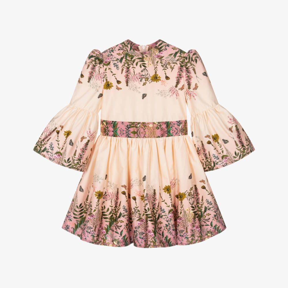 A lovely two-tone pink dress for girls by Marlo Kids, made in soft and breathable cotton. This pretty design is styled with a high neckline and flared three-quarter-length sleeves. The meadow flowers and the delicate butterfly illustrations give this zip-up dress a vintage charm.