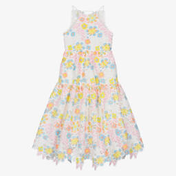 A charming white handbag for girls by Marlo Kids, woven in soft fabric. This pretty accessory features colourful floral embroidery in pastel shades of blue, green and pink. Ideal for carrying small essentials, the single compartment secures with a magnetic popper and has a short handle for easy carrying.