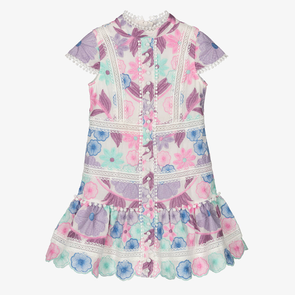 Ideal for any special occasion, this fabulous white dress for girls is by Marlo Kids. With beautiful floral embroidery in pink, purple and blue, it has white lace trims and decorative, white, fabric-covered button detailing on the front. Pretty capped sleeves and a scalloped hemline complete the look. It is fully lined for comfort.