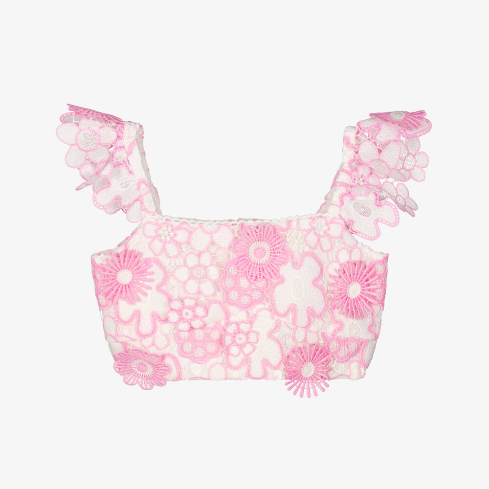 Fun, eye-catching and summery, this girls cropped top by Marlo Kids is made in white and pink floral guipure lace. Embellished with floral lace appliqués and lined in soft voile, the shoulder straps are elasticated for a comfortable fit.