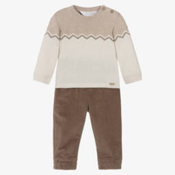 A casual beige and brown trouser set for baby boys by Mayoral, made in soft, comfortable cotton. The cosy knitted jumper has a geometric zigzag pattern and buttons on one shoulder for easy dressing. The coordinating trousers are made in soft needlecord with a comfortable elasticated waist. Easy to wear, they simply pull up.