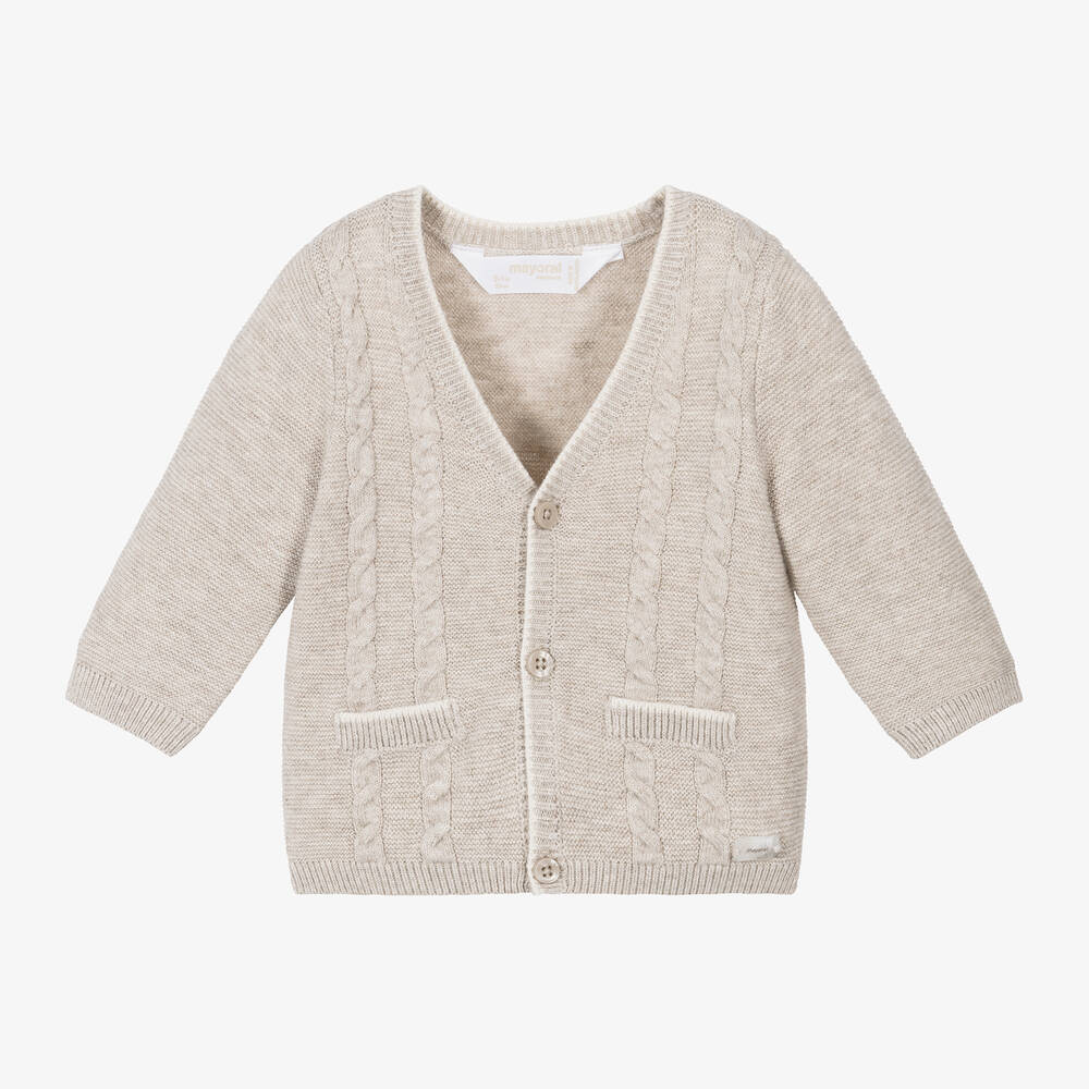 A classic beige V-neck cardigan for baby boys by Spanish brand Mayoral, knitted in a soft cotton and wool blend. This timeless layering piece has a charming cable knit design, contrasting ivory trims and faux pockets. Adding a simple designer feel, a marbled logo plaque is stitched by the hem.